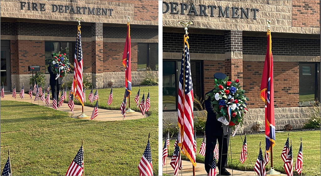 Amazing Grace [bagpipes version] was played and Matthew Graber, Town of Whiteville Fire Chief and City of Bolivar Fire Department engineer, placed a wreath. Chief Price made some closing remarks that were followed by a closing prayer by Pastor Crisp.