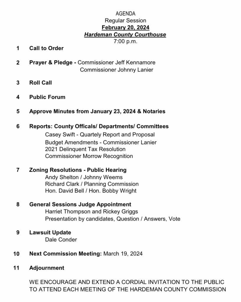 The Hardeman County Commission held its monthly meeting on Tuesday, February 20, 2024. Several items were discussed in the meeting, which lasted over four hours. You may read the agenda and watch the full meeting below.