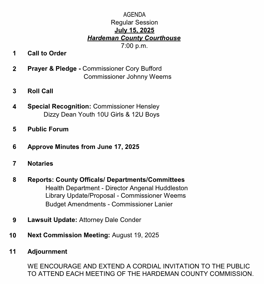 The Hardeman County Commission held its monthly meeting on Tuesday, July 15, 2025. Several items were discussed in the meeting. You may read the agenda and watch the full meeting below.