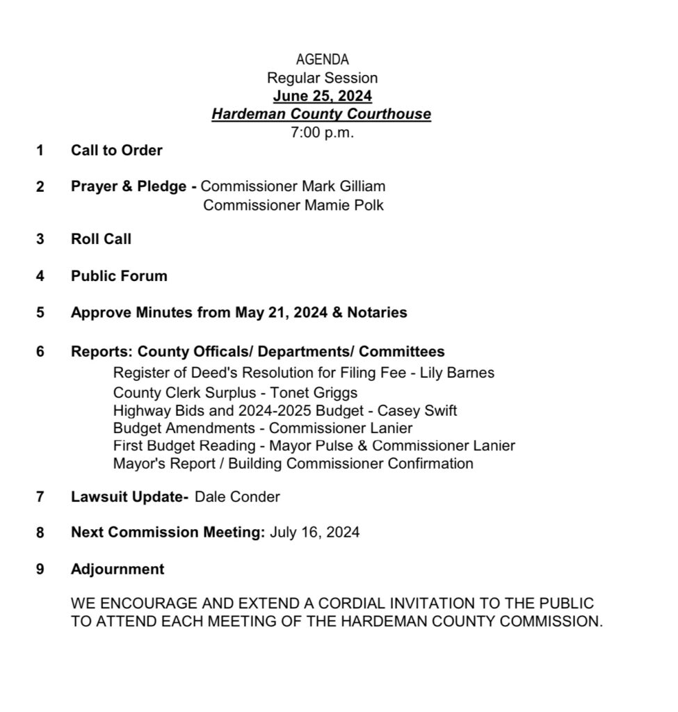 The Hardeman County Commission held its monthly meeting on Tuesday, June 25, 2024. Several items were discussed in the meeting. You may read the agenda and watch the full meeting below.