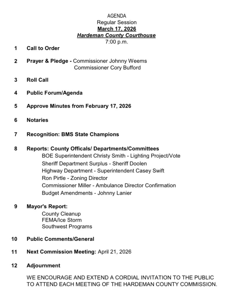 The Hardeman County Commission held its monthly meeting on Tuesday, March 17, 2026. Present at the meeting were Hardeman County Commissioners David Bell, Cory Bufford, Russell DeBerry, Michion Gatlin, Mark Gilliam, Brad Grantham, Bobby Hensley, Joseph Jenkins, Jeff Kennamore, Chandra Lake, Johnny Lanier, Bethany Miller, Jackie Sain, John Vickers, Johnny Weems, Bobby Wright, and Mayor Todd Pulse.