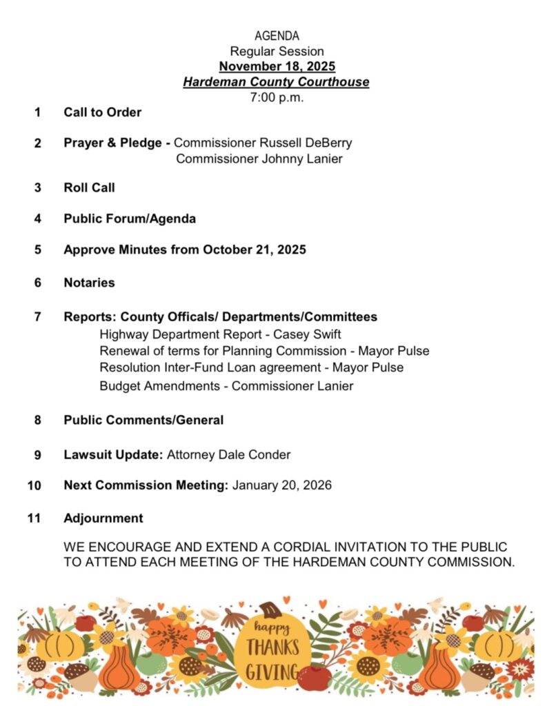 The Hardeman County Commission held its monthly meeting on Tuesday, November 18, 2025. Present at the meeting were Hardeman County Commissioners David Bell, Cory Bufford, Russell DeBerry, Mark Gilliam, Brad Grantham, Bobby Hensley, Joseph Jenkins, Jeff Kennamore, Chandra Lake, Johnny Lanier, Bethany Miller, Jackie Sain, Johnny Weems, Bobby Wright, and Mayor Todd Pulse. Commissioners Michion Gatlin and John Vickers were absent. Several items were discussed in the meeting. You may read the agenda and watch the full meeting below.