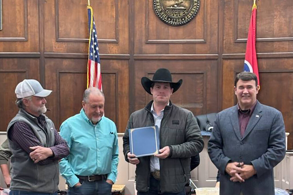 Rodeo heeler and Bolivar, Tennessee native Lane Mitchell was recognized by Hardeman County Mayor Todd Pulse, who proclaimed December 22 as Lane Mitchell Day. Lane is no amateur when it comes to recognition proven by his recent performance at the 2025 Wrangler National Finals Rodeo where he ended the year ranked #11 in the world of heelers. Despite that accomplishment, being recognized by his hometown probably falls close to that win, which is another moment in Lane living his dream as a professional roper.