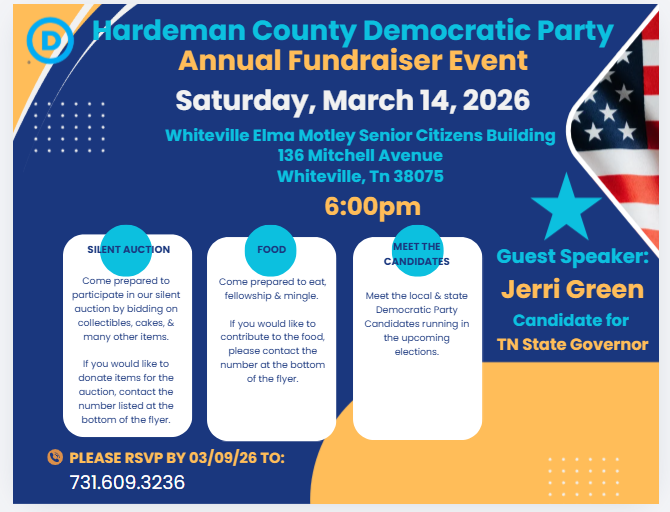 The Hardeman County Democratic Party will host its Annual Fundraiser on Saturday, March 14, 2026, at 6:00 p.m. The event will be held at the Whiteville “Elma Motley” Senior Citizens Building located at 136 Mitchell Avenue, Whiteville, TN 38075.
