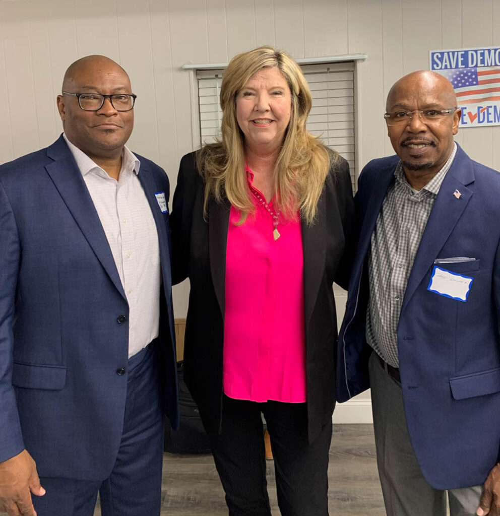 Pictured (l to r): Hardeman County Democratic Party Chair Rickey Griggs, Tennessee State Representative Gloria Johnson, and Town of Whiteville Mayor Gene Bowden.