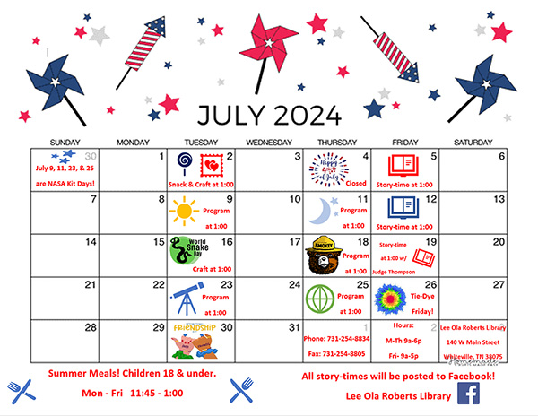 - Friday, July 26, at 1 p.m.: Summer Reading finale with ice cream and awards.