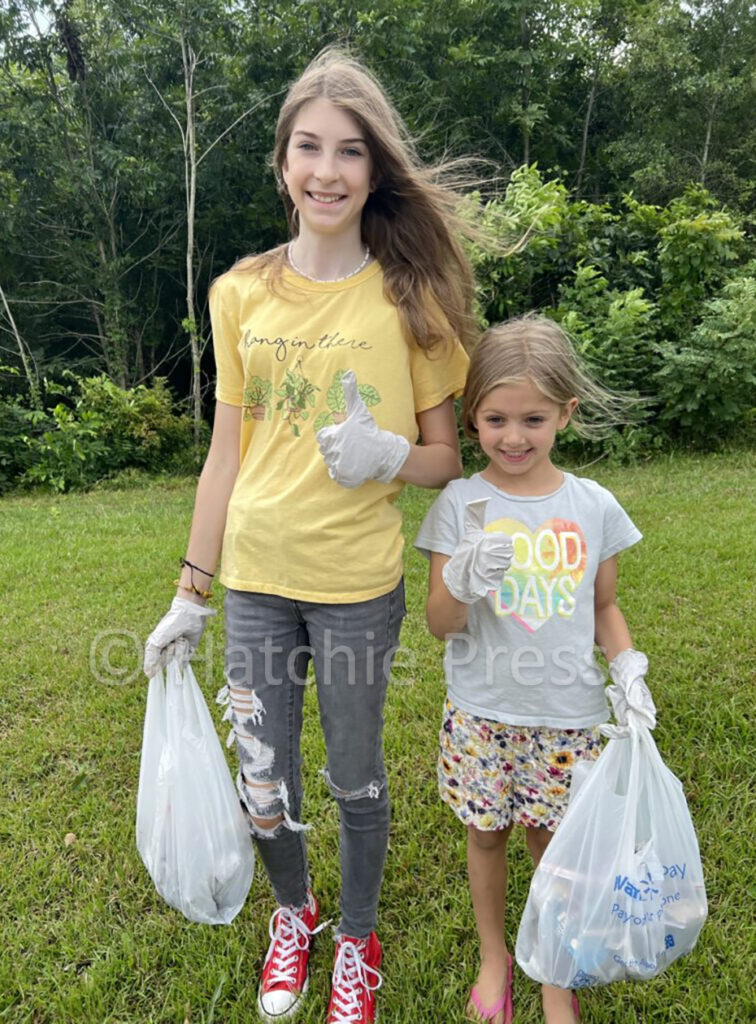 Leah Davis and Dallas Bell picked up trash along a street in Bolivar.