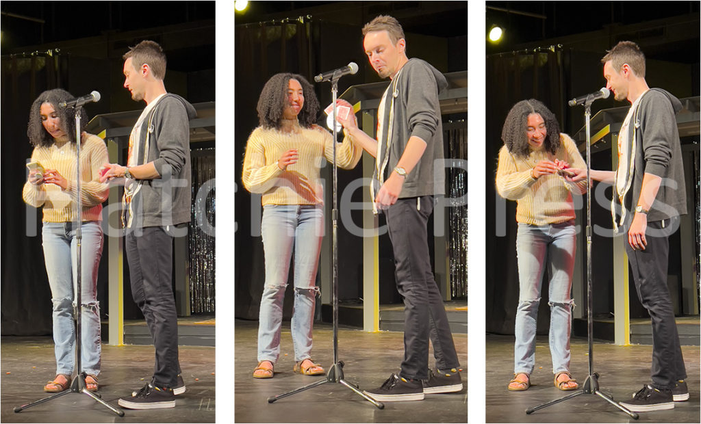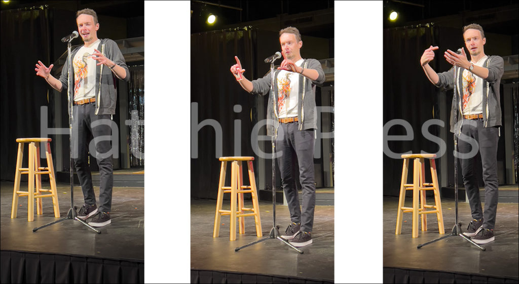 Braden Foster (and his stool) brought a shift to the evening. He was introduced as a magician, but his comedic flair was immediately evident.