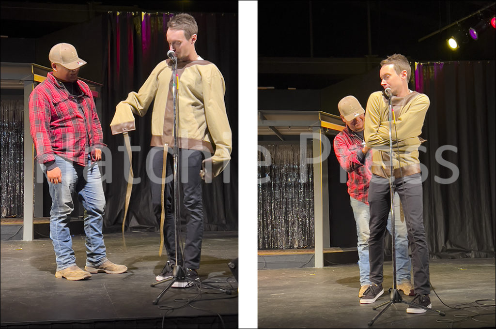 Every magician needs an assistant, and Braden was able to lure two willing volunteers from the audience. Besides the stool, Braden also had a deck of cards, and a straight jacket.