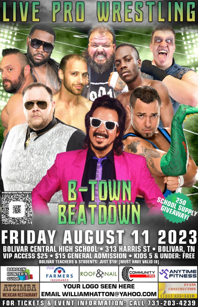 The Bolivar B-Town Beatdown takes place on Friday, August 11, 2023, at Bolivar Central High School. WWE Hall Of Famer Jimmy Hart returns to Bolivar and Santino Marella makes his first appearance in Bolivar! Tickets are $25 VIP, $15 General Admission, $10 for students and teachers area-wide (must provide valid school ID). VIP enters at 5:30 p.m., general admission at 6:30 p.m., and the show begins at 7 p.m. Come support this event and this exciting fundraiser for Bolivar Central High School!