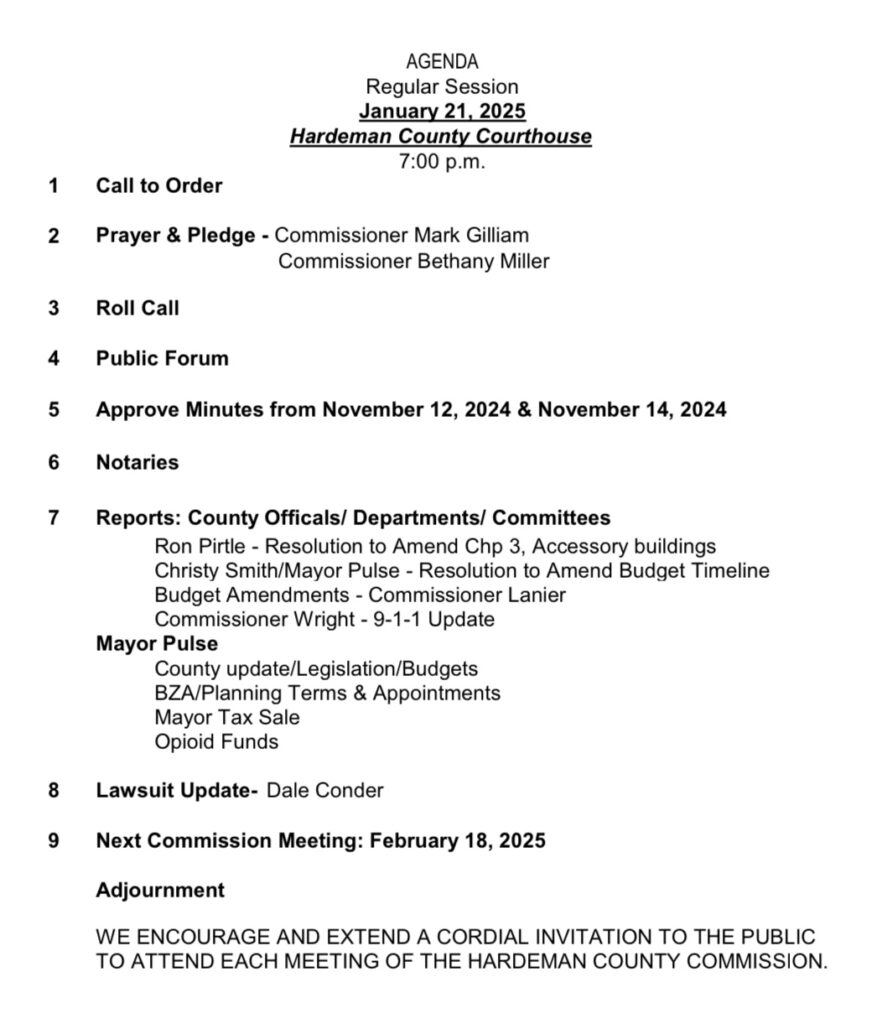 The Hardeman County Commission held its monthly meeting on Tuesday, January 21, 2025. Several items were discussed in the meeting. You may read the agenda and watch the full meeting below.