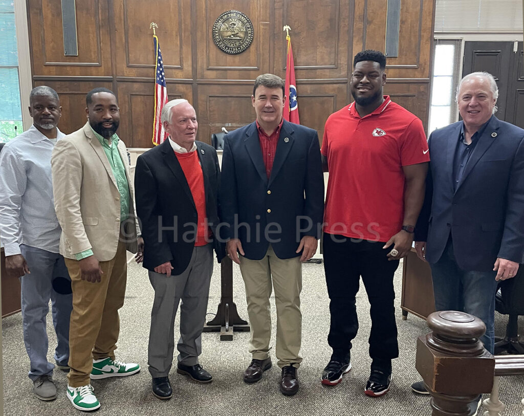 Pictured (l to r): Hardeman County Commissioner Joseph Jenkins, City of Bolivar Mayor Julian McTizic, SWHRA Executive Director Mike Smith, Hardeman County Mayor Todd Pulse, Kansas City Chief Trey Smith, and Senator Page Walley.