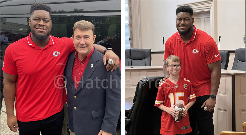 Pictured (l to r): Trey Smith arrives in Hardeman County and poses with Mayor Todd Pulse. A fan poses with Kansas City Chief Trey Smith.
