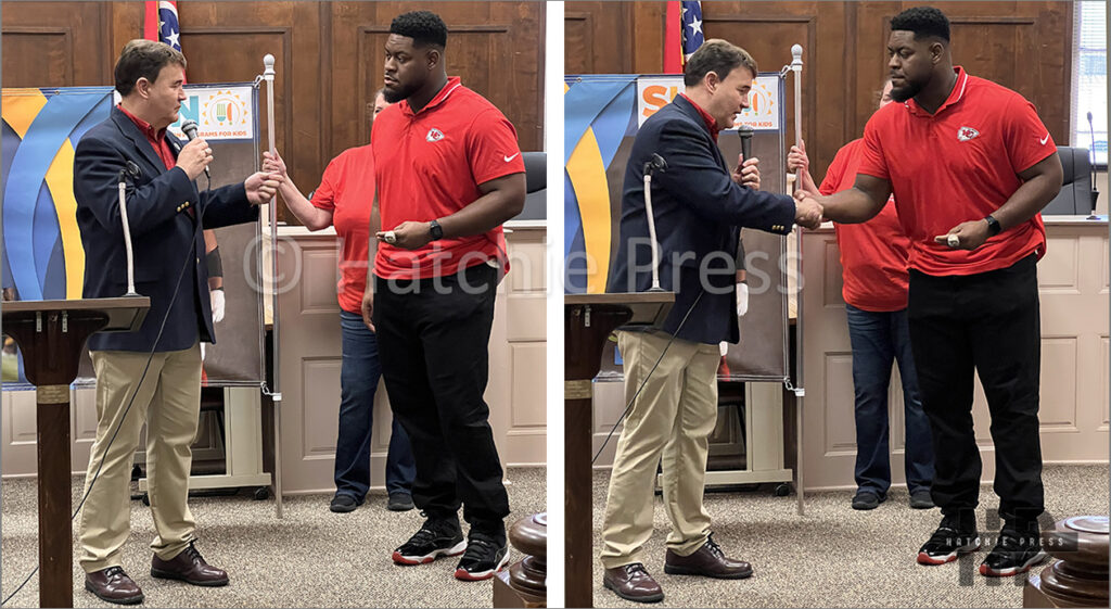 Hardeman County Mayor Todd Pulse presents Kansas City Chief Trey Smith with a “coin for the county”- a commemorative Hardeman County bicentennial coin.