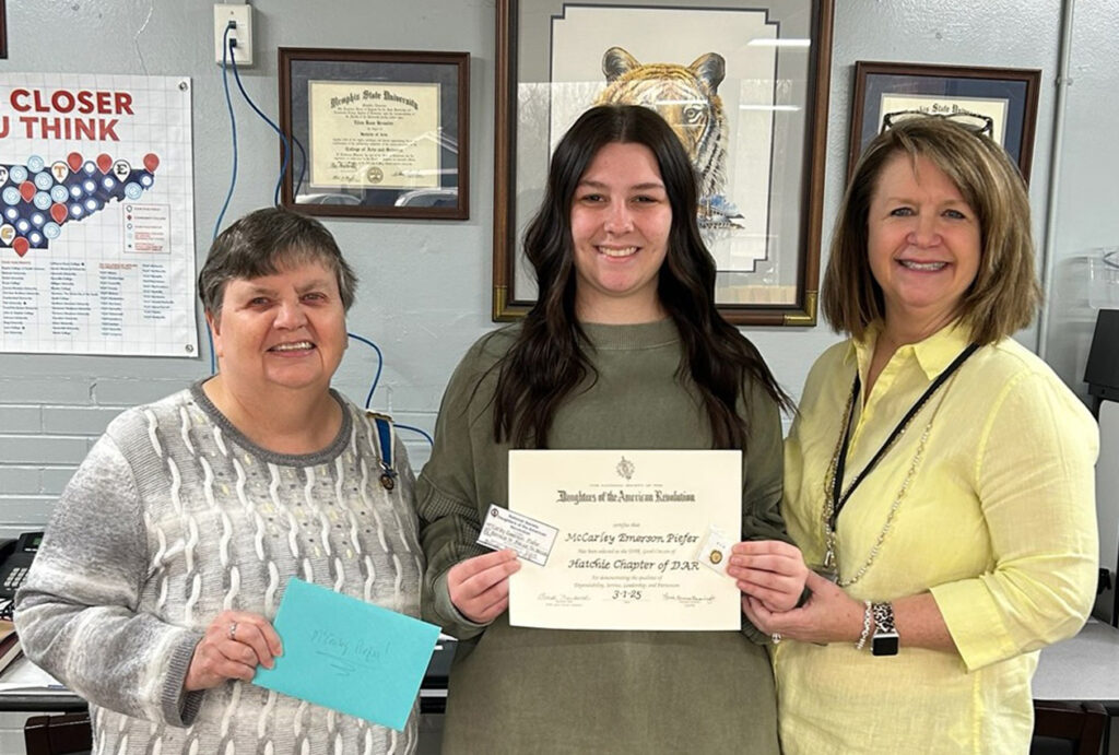 Pictured (l to r): Mary Moore, Hatchie Chapter Regent; McCarley Emerson Piefer, Student Extraordinaire; and Deana Sain, DAR Good Citizens Chairman.