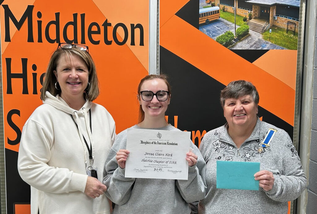 Pictured (l to r): Deana Sain, DAR Good Citizens Chairman; Jenna Claire Kirk, Student Extraordinaire; and Mary Moore, Hatchie Chapter Regent.