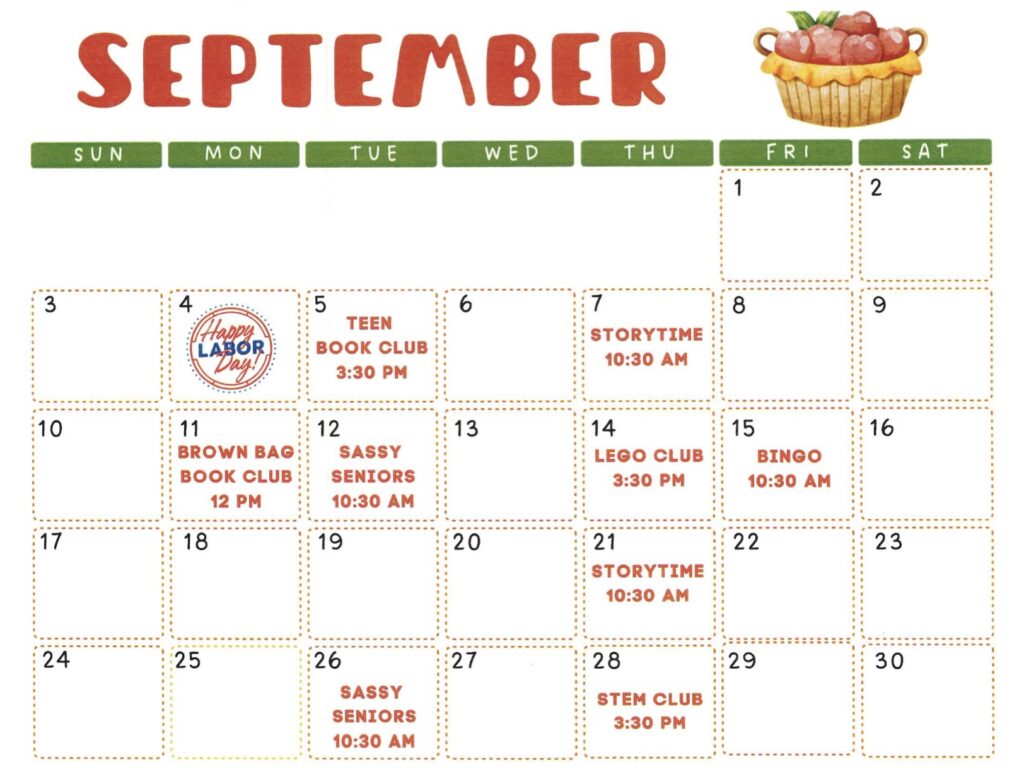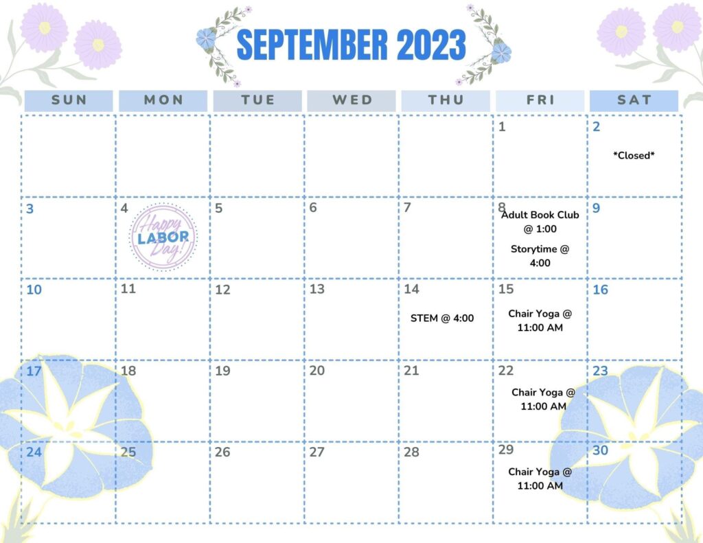 - September 8 – Adult Book Club at 1 p.m. and Storytime at 4 p.m.