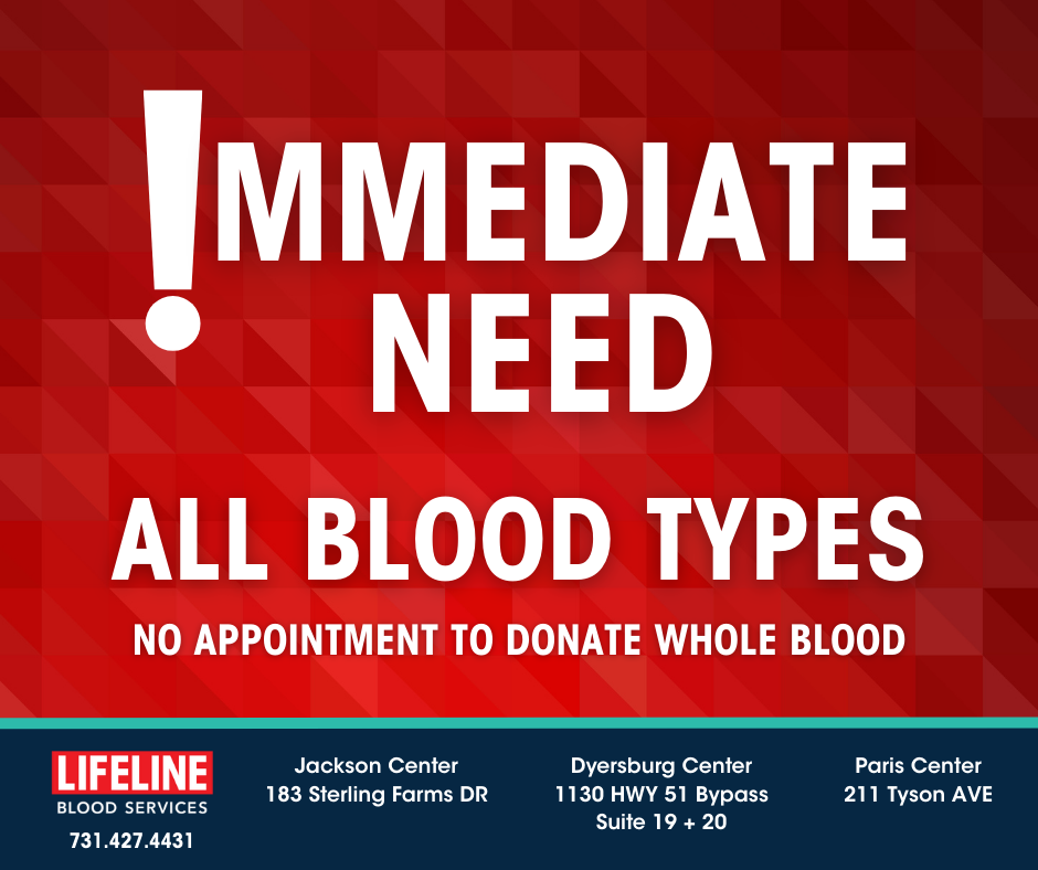 OPEN: Jackson Center 9am-6pm, Dyersburg Center 8am-4pm and Paris Center 10am-4pm. No blood drives are scheduled due to road conditions.
