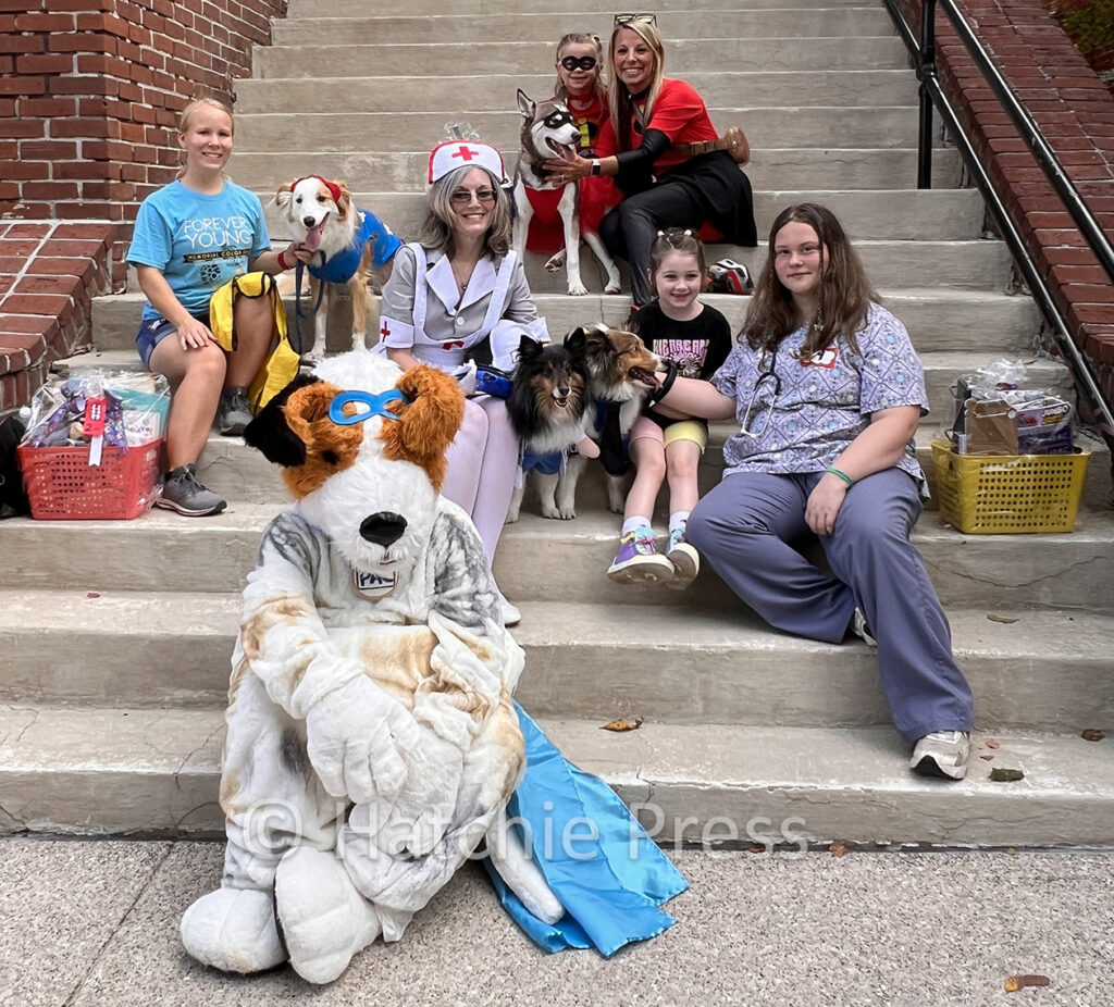 The HAA Costume Contest Winners were 1st Place – The Incredibles with Megan and Zoey Roberts; Second Place – Firefighter (undercover) Daisy with Sarah Clos; and 3rd Place – Everyday Super Hero dogs Chanel (veterinarian) and Connery (policeman) with Karen Lax (nurse), Jolie King (nurse), and Charlie Dowell.