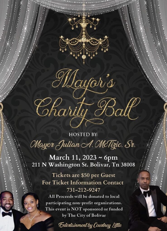 The Mayor’s Charity Ball will be held on Saturday, March 11, 2023, at 6 p.m. at the Bolivar Municipal Center, 211 North Washington Street, Bolivar, Tennessee 38008.