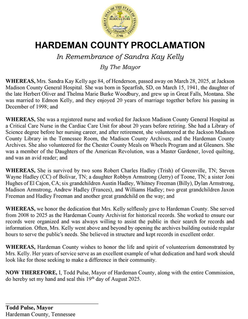 During the Hardeman County Commissioners meeting on Tuesday, August 19, 2025, Hardeman County Mayor Todd Pulse took a moment to present a proclamation to the family of the late Sandra Kay Kelly, for her work as the Hardeman County Archivist for historical records. She served for 17 years in that capacity from 2008 to 2025.