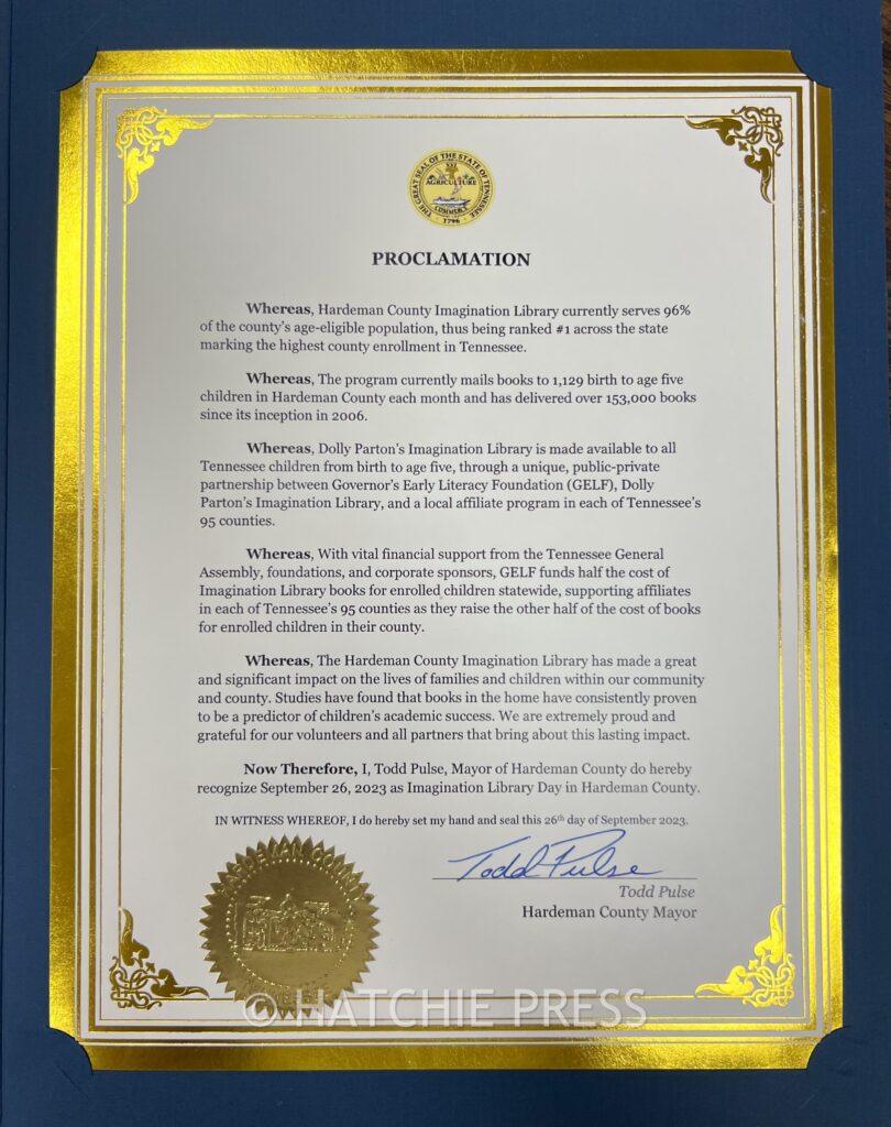 Mayor Todd Pulse recognized Tuesday, September 26, 2023, as Imagination Library Day in Hardeman County in celebration of Hardeman County reaching the highest county enrollment rate across the state.