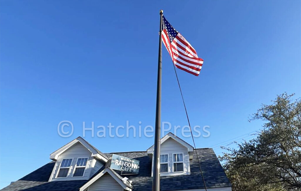 The flagpole stands outside of the Rainbo Inn Café Coffee & Diner/Green Frog Coffee and Grill, which is in the center of downtown Middletion.