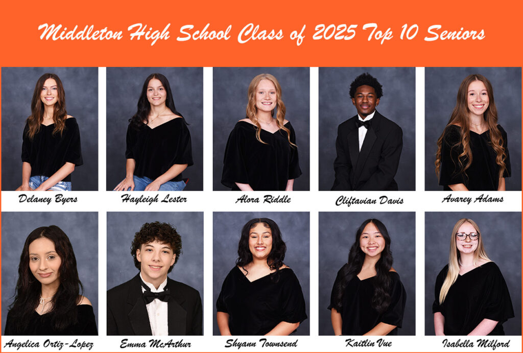 Middleton High School announced its Top 10 seniors for the Class of 2025 on Wednesday, April 9, 2025. Coming out on top in the order they were ranked are Delaney Byers, Hayleigh Lester, Alora Beth Riddle, Cliftavian Davis, Avarey Adams, Angelica Ortiz-Lopez, Emma McArthur, Shyann Townsend, Kaitlin Vue, and Isabella Milford.