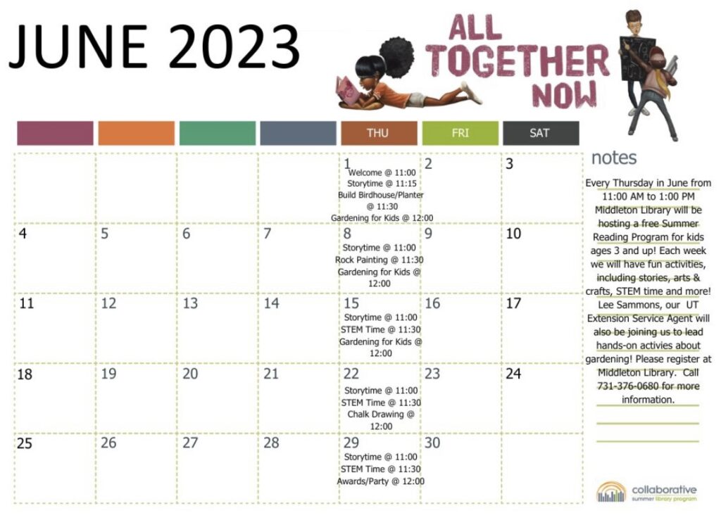 The Middleton Library will be hosting a free Summer Reading Program for kids ages three and older every Thursday in June from 11 a.m. to 1 p.m.