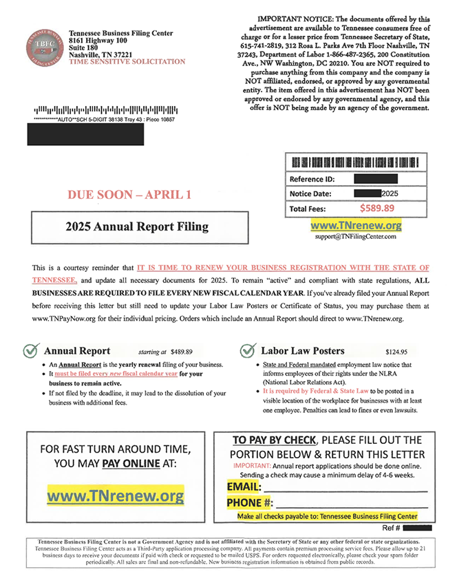 As part of the scam, businesses receive an official-looking mailer from a third party called Tennessee Business Filing Center. Wording on the mail piece threatens recipients with additional fees and business dissolution if they do not file their reports through the Tennessee Business Filing Center before the Tuesday, April 1, 2025, deadline.