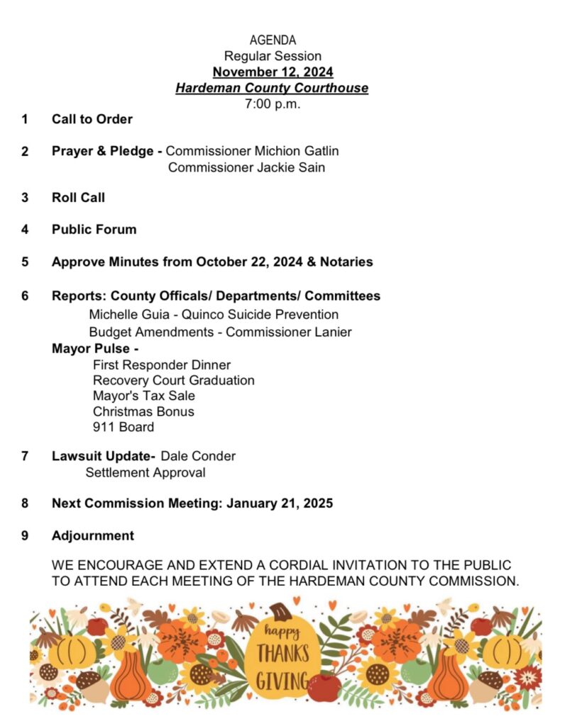 The Hardeman County Commission held its monthly meeting on Tuesday, November 12, 2024. Several items were discussed in the meeting. You may read the agenda and watch the full meeting below.