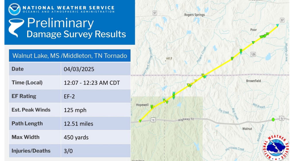 The EF-2 tornado started out around Walnut Lake, Mississippi, and traveled approximately 13 miles toward Middleton, Tennessee. It produced estimated wind speeds of 125 miles per hour. Three injuries were reported with this tornado.
