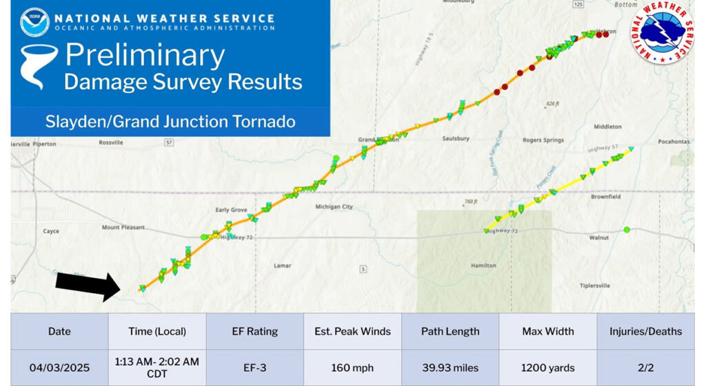 The EF-3 tornado began around Slayden, Mississippi, and traveled approximately 40 miles in total, toward Grand Junction, Tennessee, and continuing on into the Hebron area. It produced estimated wind speeds of 160 miles per hour. Two injuries and two deaths were reported with this tornado.