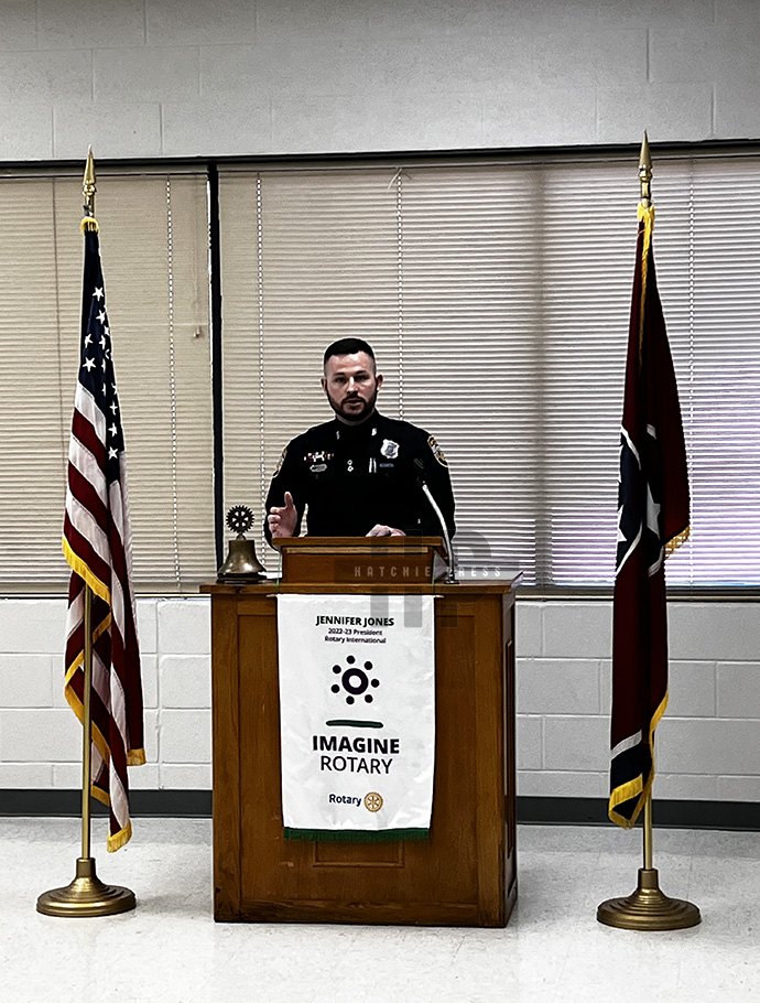 Memphis Police Officer Chris Williams spoke at a recent meeting of the Hardeman County Rotary Club and shared his experiences of patrolling the streets of the City of Bolivar and the City of Memphis. Although both cities are different in geographical size, number of officers that patrol the streets, and the types of crime that occurs, Officer Williams noted each city has the same goal of keeping its citizens safe. He also shared some of the programs the city of Memphis is implementing to better protect its citizens, and some ideas of how a police department can better serve its community.