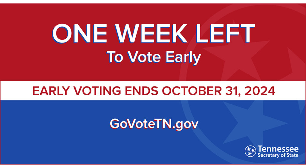 Tennessee Secretary of State Tre Hargett today reminded all registered Tennessee voters they have one more week to utilize the flexibility and convenience of the early voting period to cast a ballot ahead of the Nov. 5 State and Federal General Election.