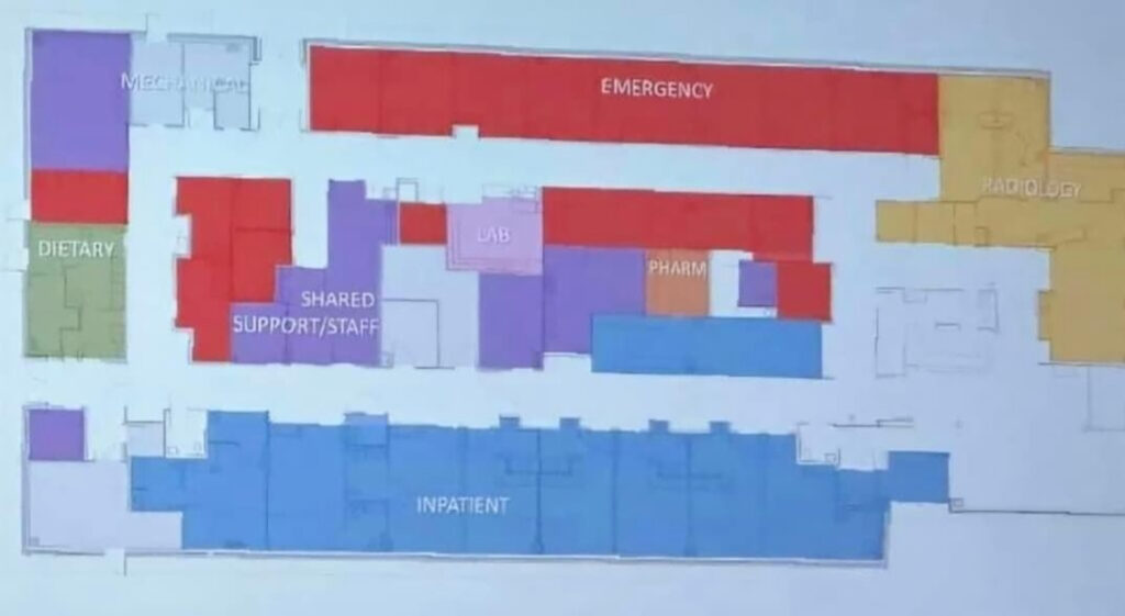 The new hospital is planned to include emergency, inpatient, radiology, and ancillary departments.