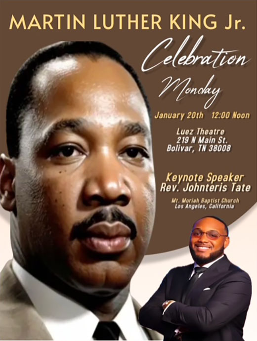 A Martin Luther King Jr. Celebration will be held on Monday, January 20, 2025, with keynote speaker Reverend Johnteris Tate of the Mount Moriah Baptist Church of Los Angeles, California. The free event will be held at the Luez Theater { 219 North Main Street, Bolivar, 38008 } at 12 p.m. The community is invited to attend to celebrate the life and legacy of Dr. Martin Luther King Jr.