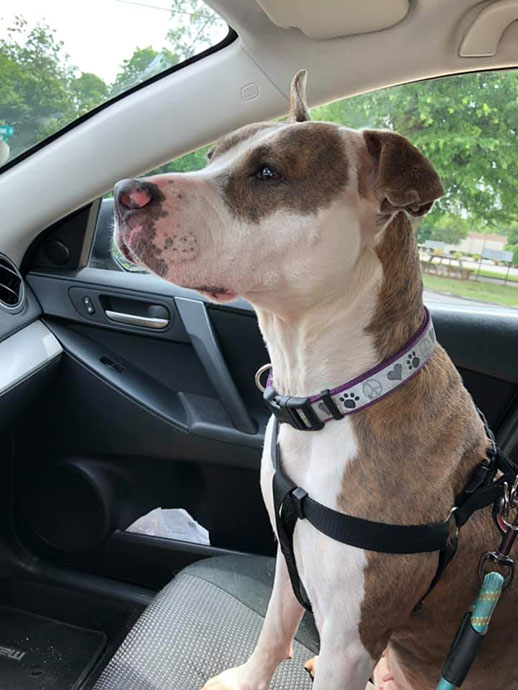 Sally is one of the sweetest, most well-mannered dogs you will ever meet. At around eight or nine years old, she is past the wild puppy stage—quietly playful, never rowdy, and always gentle. She is easy to walk on a leash, loves car rides, and is the kind of dog who melts into your arms when you hug her.