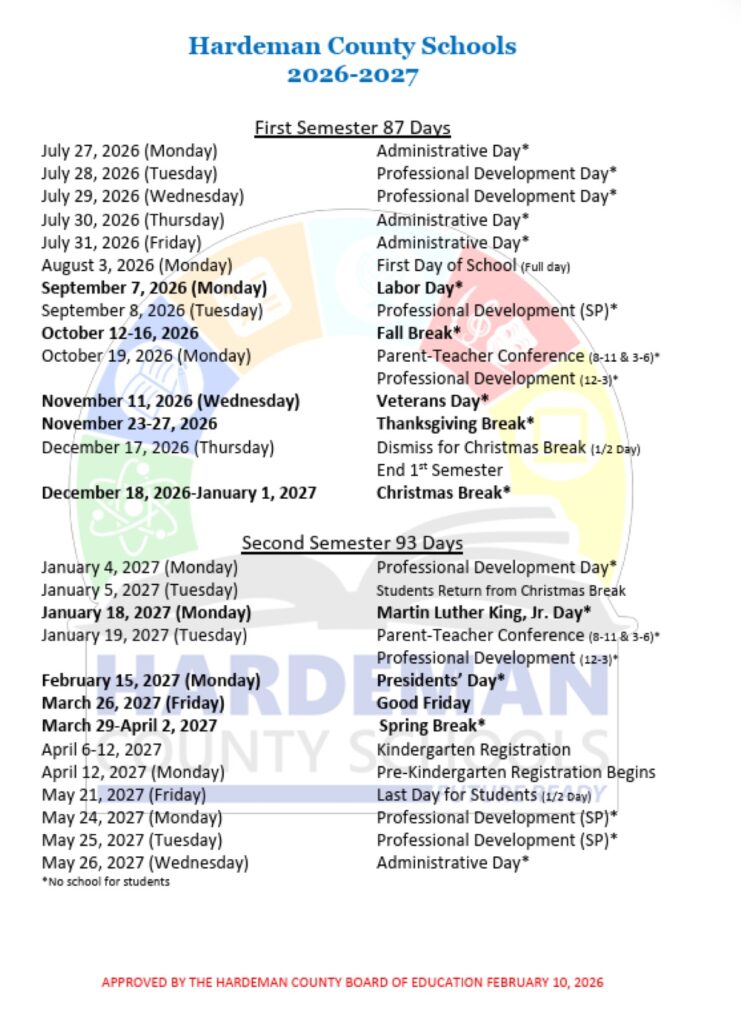 The Hardeman County Schools released its 2026/2027 school calendar, which was approved by the school board on Tuesday, February 10, 2026.