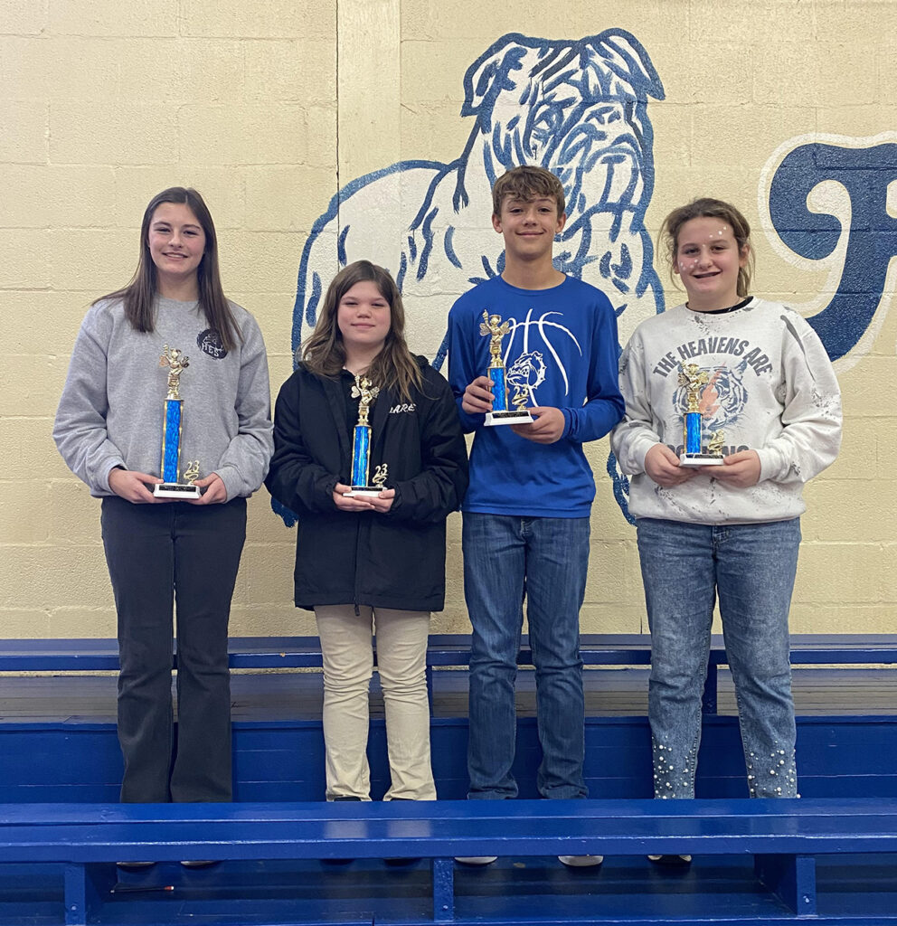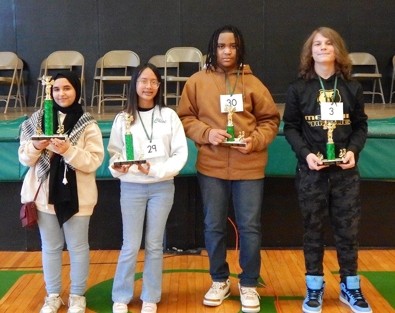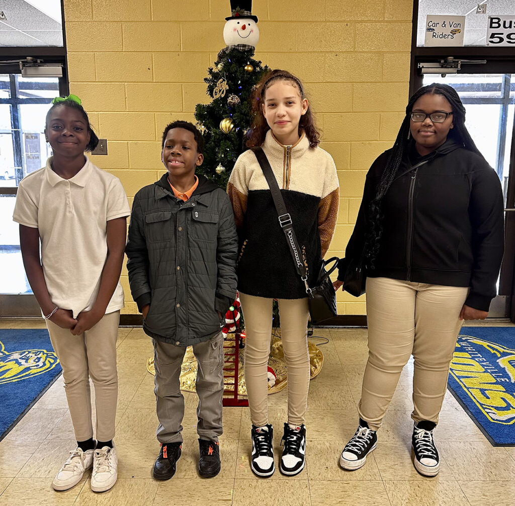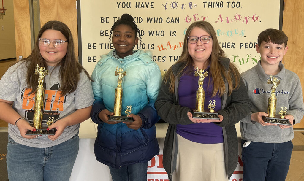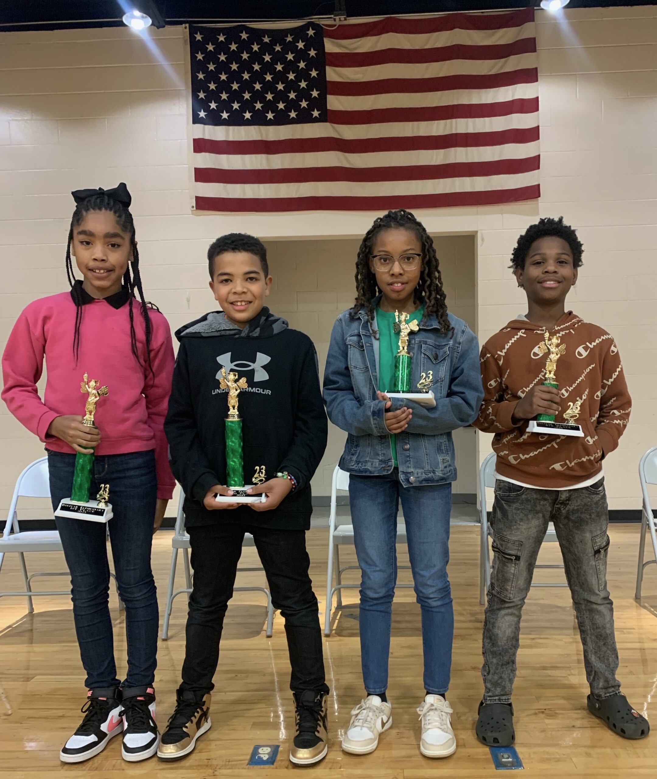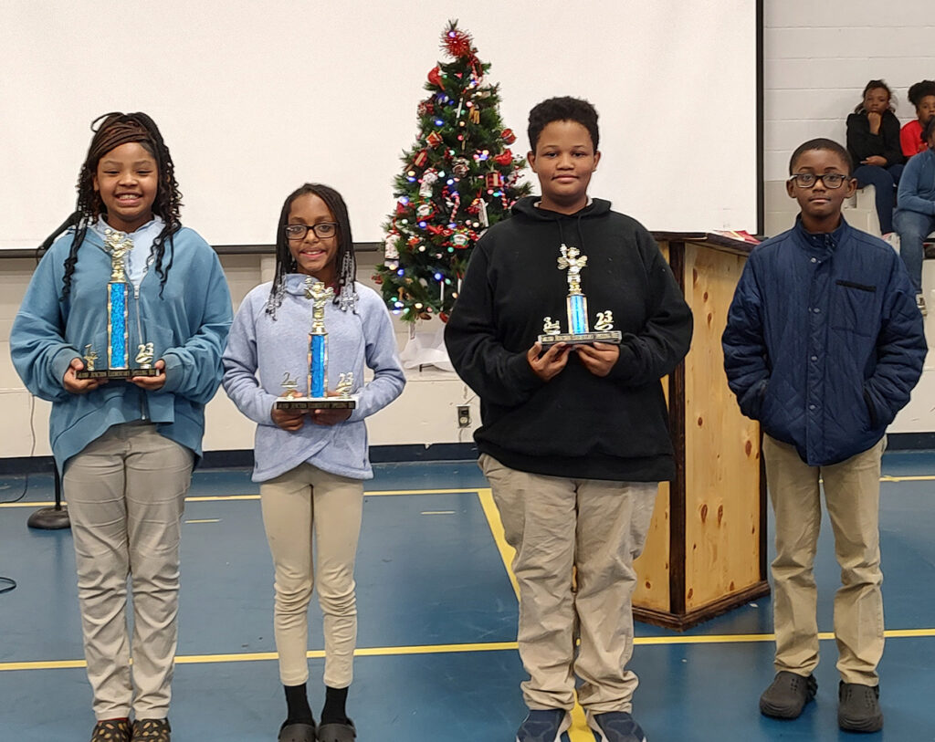 2nd Place – Makayla Anderson (4th grade), 3rd Place – Alandus Crumb (6th grade), and 4th Place/Alternate – Terrance Geanes (5th grade).