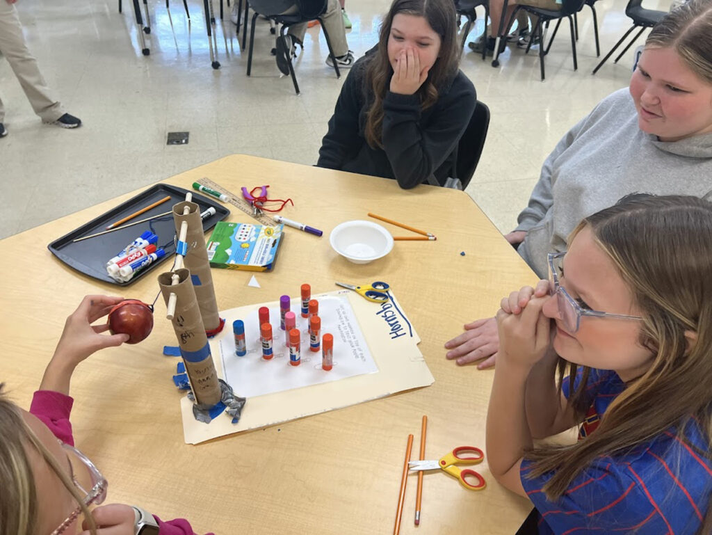 “Students love hands-on activities! Sixth graders from each school are participating in the Marble Down S.T.E.M. Challenge where they design a marble maze that takes the marble as long as possible to travel from the top to the bottom of the maze without getting stuck or falling off the track. On Awards Day in May 2025, the group with the best time will receive STEM trophies. Eighth graders from each school are participating in the Apple Annihilator Project. This focuses on Newton’s Laws of Motion and the group with the highest score will be recognized on Awards Day. I haven’t chosen a seventh-grade project yet,” said Ms. Sain.