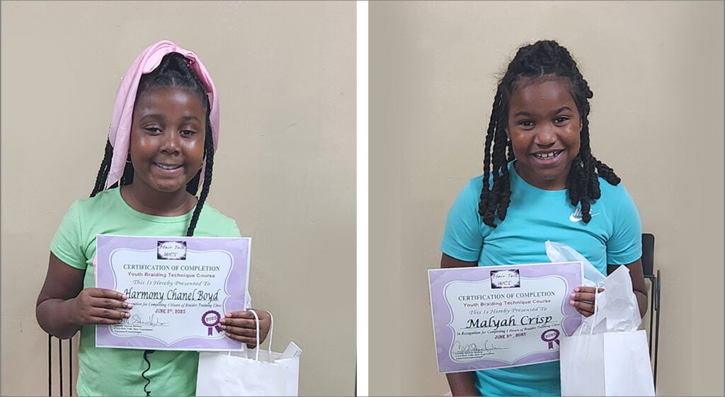 Pictured (l to r): Harmony Boyd and Malyah Crisp each received a certificate of completion for the Youth Braiding Technique Course.