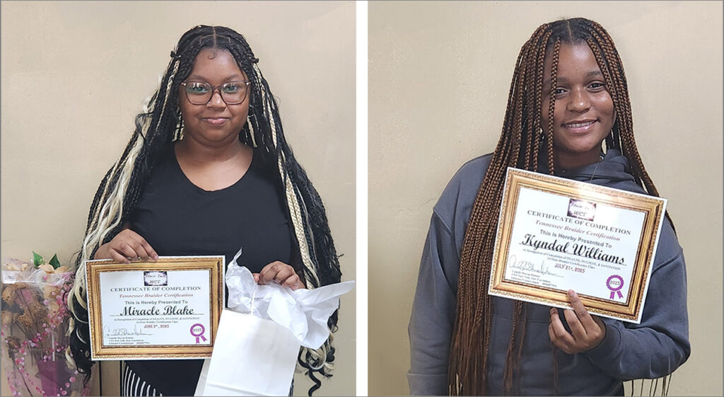 Pictured (l to r): Miracle Blake and Kyndal Williams each received a certificate of completion for the Tennessee Braider Certification.