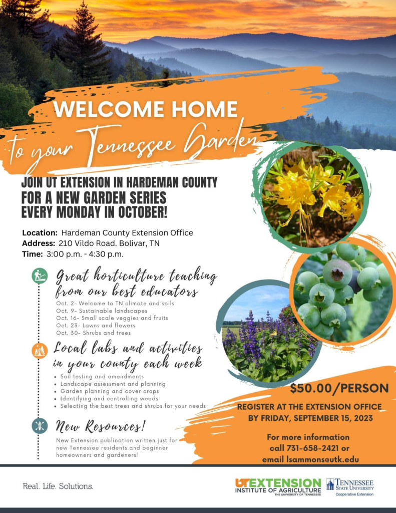 Join UT Extension in Hardeman County for a new Garden Series every Monday in October. Classes will be held from 3 p.m. to 4:30 p.m. at the UT Extension office in Bolivar. The series will include the following topics: