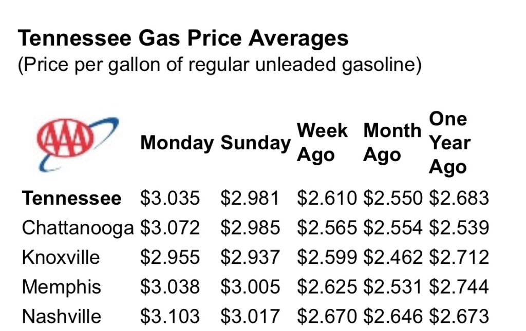 “With crude oil prices surging again over the weekend, Tennessee drivers should prepare for another round of increases at the pump in the coming days,” said Megan Cooper, spokeswoman for AAA – The Auto Club Group. “About 60% of what we pay at the pump is in direct correlation to the price of crude. Because of this, any time we see sharp rises in the price of crude oil, we typically expect to see our gas prices rise as well.”