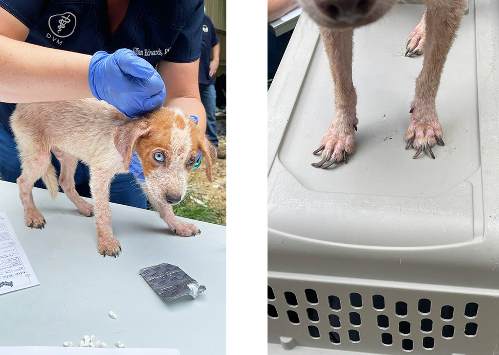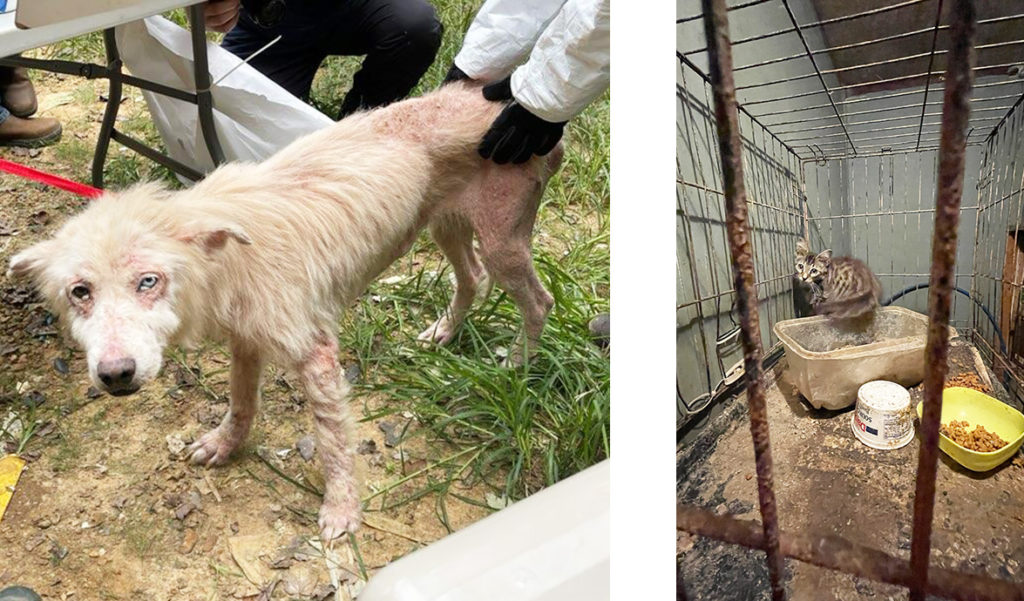 The cats were living in small crates filled with feces and maggots. The dogs were loose both inside and outside the trailer. Because of the lack of veterinary care and the unsanitary, inhumane living conditions, the animals are suffering from a range of medical issues. Those include broken bones, severe anemia, high ammonia exposure, mange, severe and painful disease, overgrown nails, fur loss, skin inflammation, ear and eye infections and injuries, and severe internal and external parasites (including fleas and ticks). Despite the conditions in which the animals were found, surprisingly none were deceased.