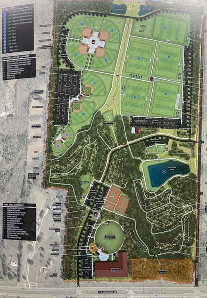 In addition to the Sports Complex, the Oakland Parks and Recreation area will also include a community playground, spray park, four-acre pond, restrooms, tennis courts, pickle ball courts, dog park, 18-hole disc golf, 2.5-mile paved walking trail, multipurpose building, group shelters, and ample parking.