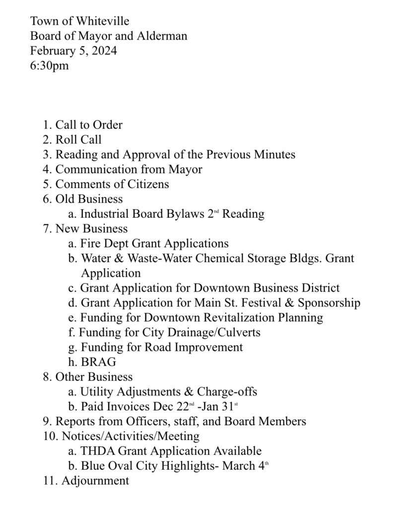 The Town of Whiteville held its monthly meeting on February 5, 2024. Several items were discussed. You may read the agenda and watch the full meeting below.