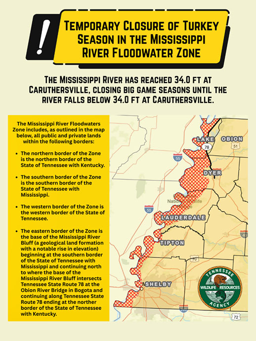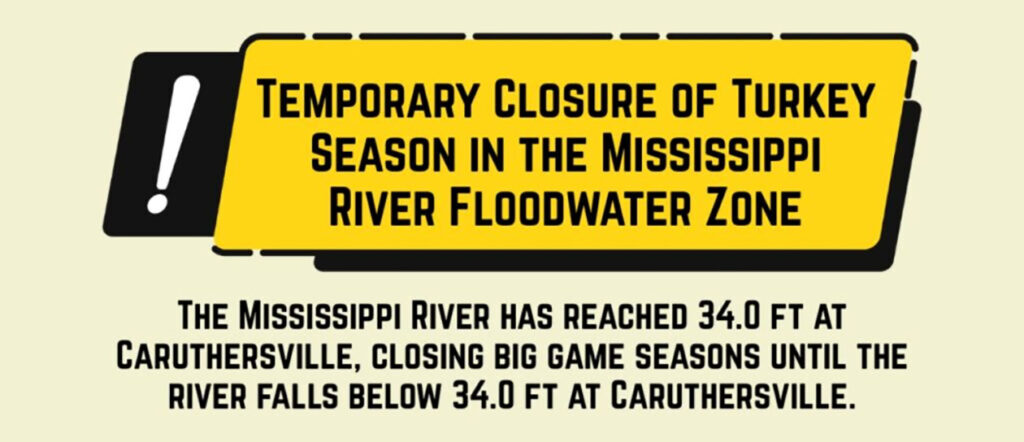 The Mississippi River has reached a stage of thirty-four feet (34.0 ft.) at the Caruthersville gauge (U.S. Army Corps of Engineers gauge at river mile 846.4). As a result, all big game hunting in the Mississippi River Floodwaters Zone will be closed. This closure will remain in effect until the river stage falls below thirty-four feet (34.0 ft.) at the Caruthersville gauge. The closure applies to both private and public lands within the Zone and will impact the spring turkey season.
