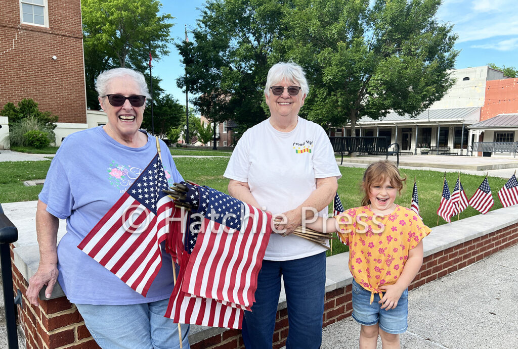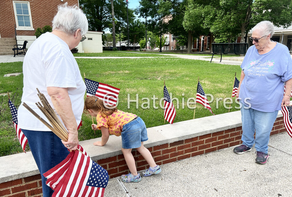 Just as they have done for the past six or seven years, the woman of the Veterans of Foreign Wars (VFW) Post #2949 Ladies Auxiliary gathered to place American flags in the grass, which surrounds the Hardeman County Courthouse. Although it was a small group, which gathered on Thursday, May 22, 2025, to place the flags, there were just enough volunteers to get the job done.